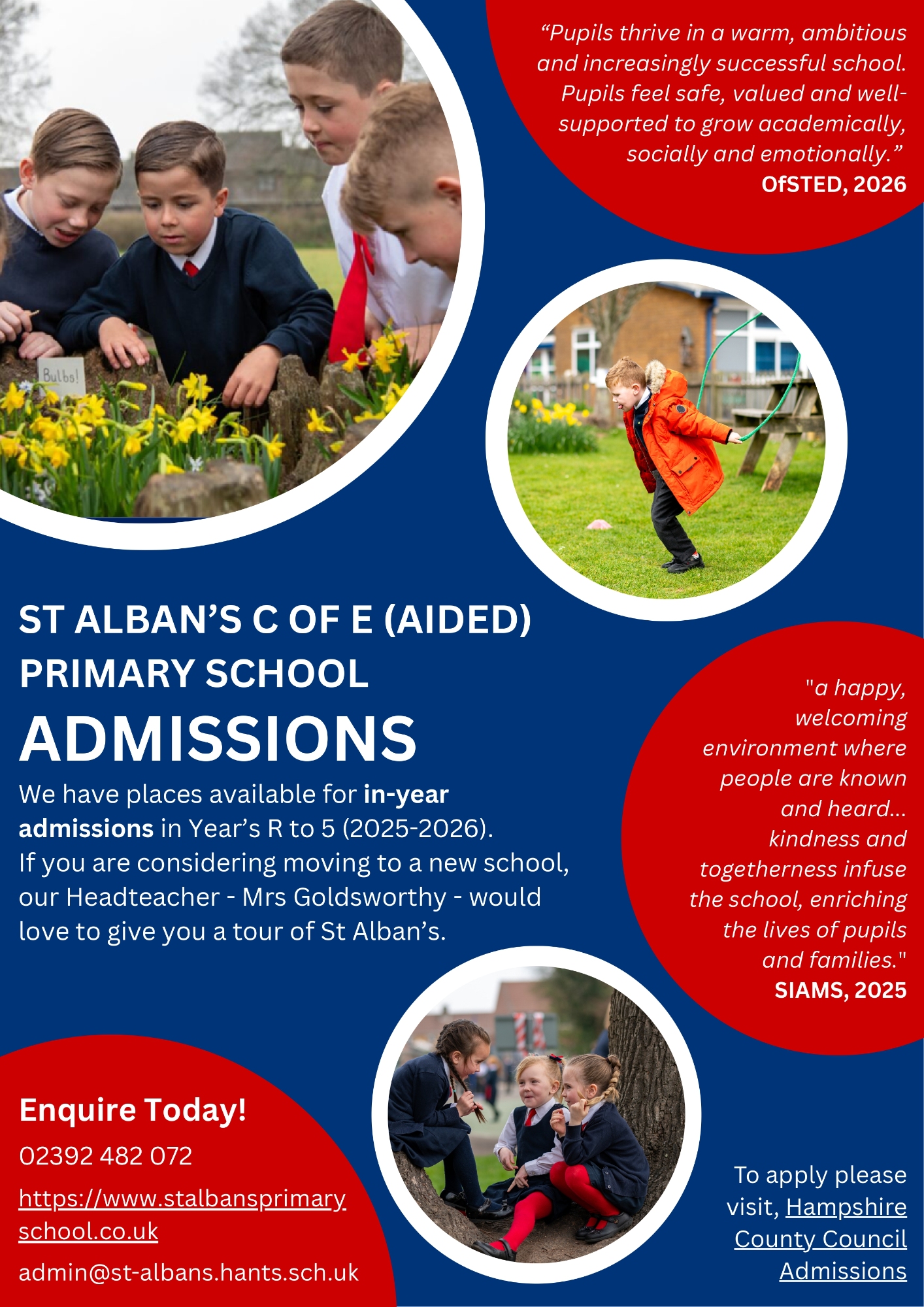 As in-year applications made for entry in the following September will only be considered 6 weeks before the start of the summer holiday in line with Hampshire County Council procedures, notification of the outcome will be made within this period.