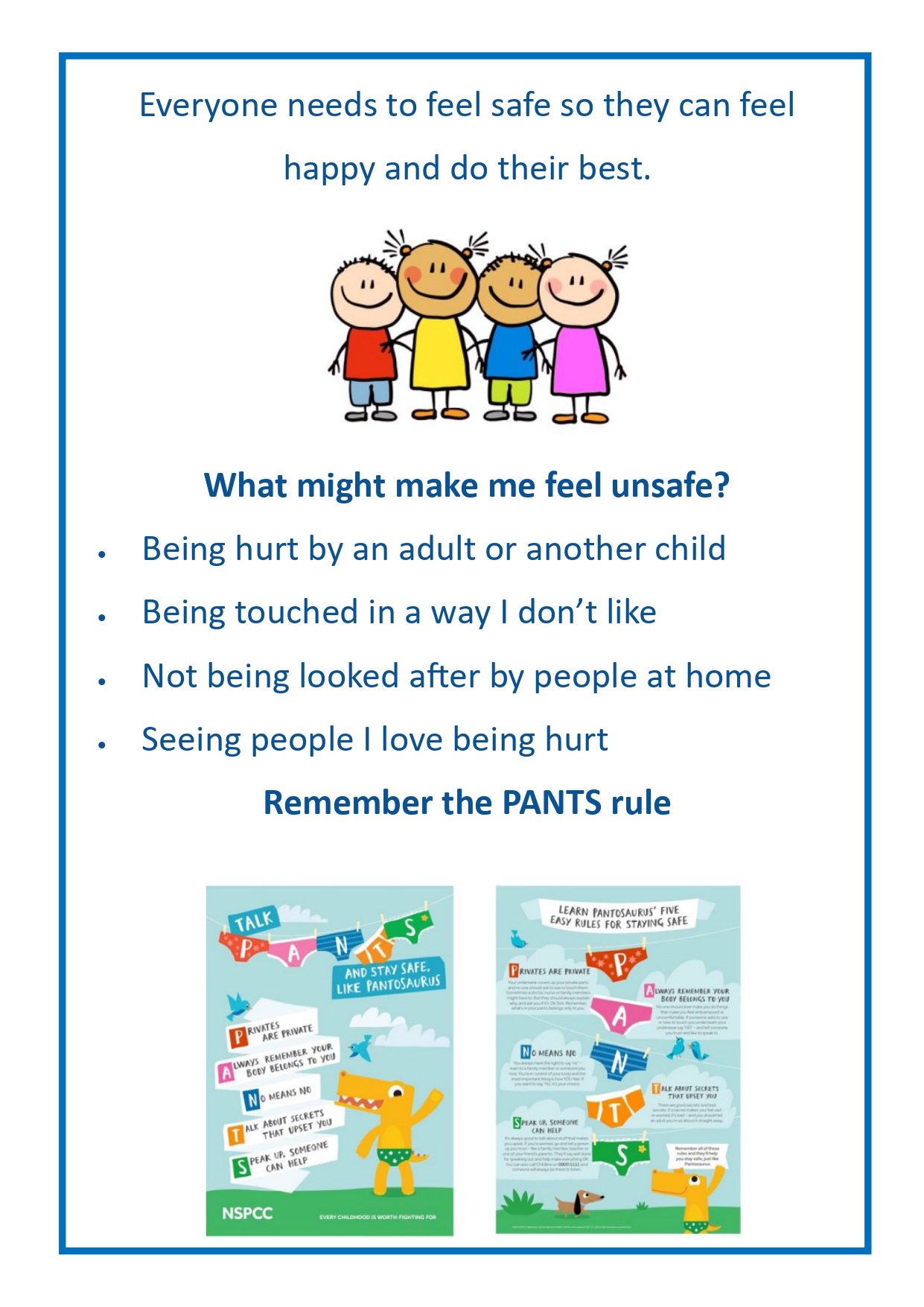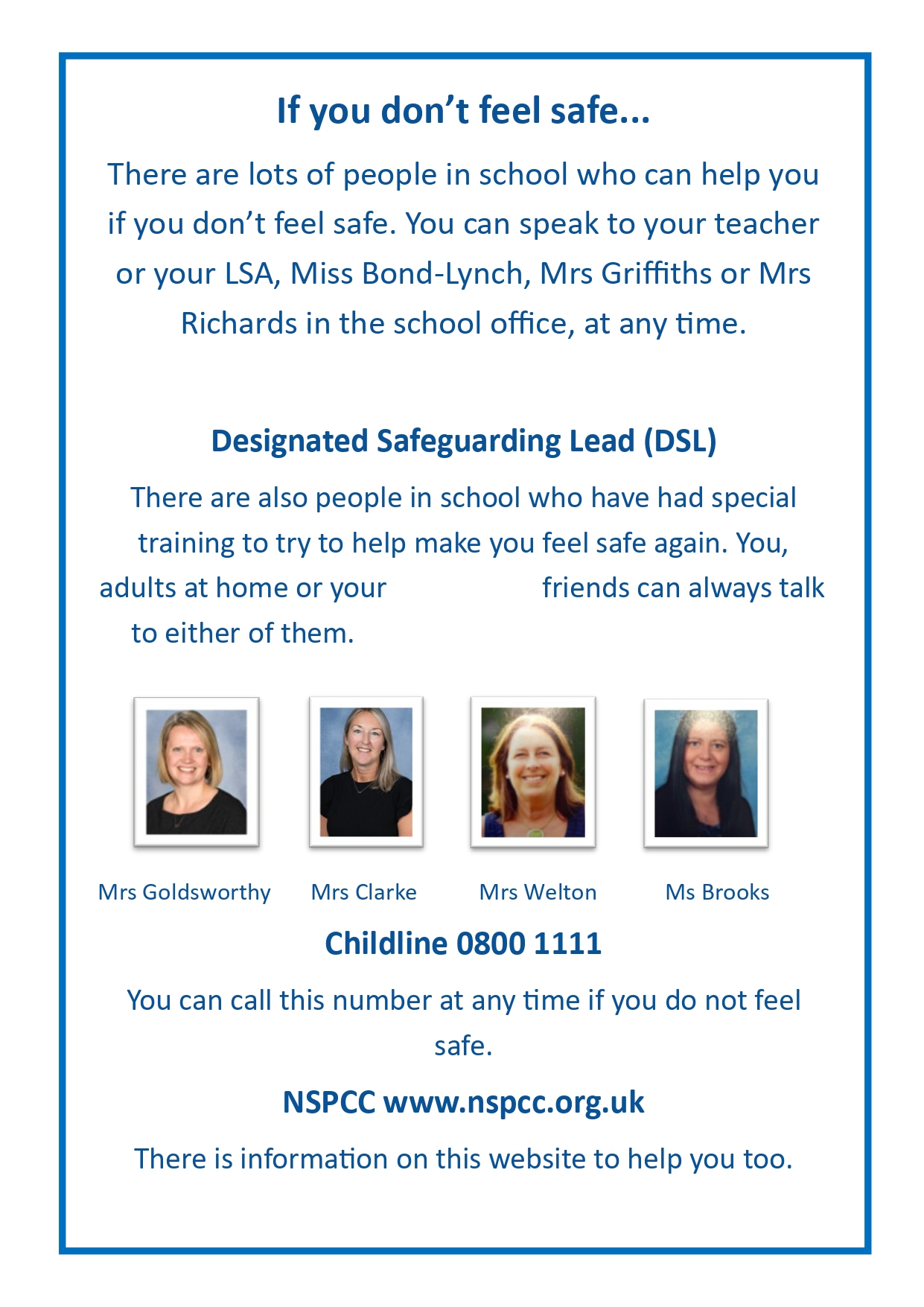 Children at St Alban's can speak to any member of school staff if they are concerned about themselves or someone else, but Mrs Goldsworthy is our Designated Safeguarding Lead. Mrs Clarke, Miss Brooks, Mrs Welton and Miss Bond-Lynch are Deputy Designated Safeguarding Leads.