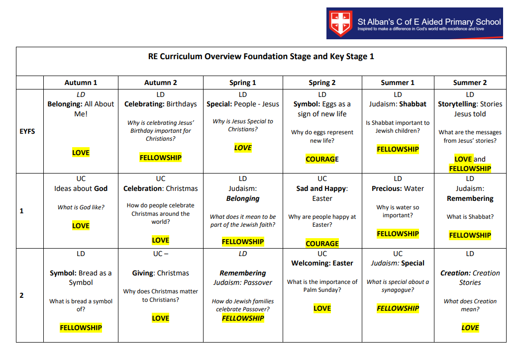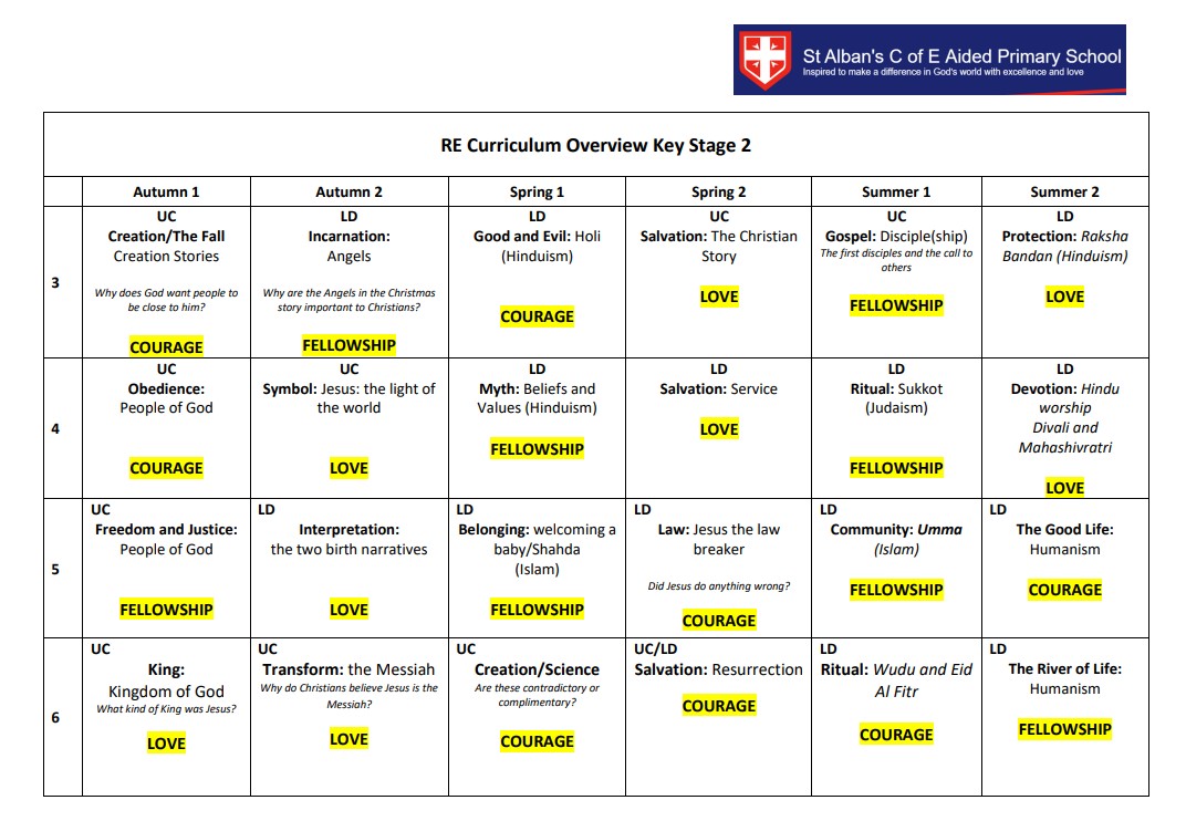 The long-term overview for each year group shows our Core Values of Love, Courage and Fellowship golden threads