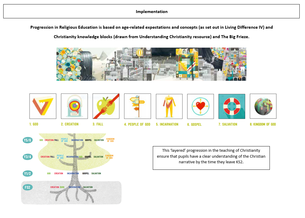Understanding Christianity content should be carefully planned into a cycle of enquiry so that fidelity to the cycle can be maintained. The core knowledge ‘building blocks’ must also be identified on the plan. At the start of a UC unit, share the relevant panel from ‘The Big Frieze’.