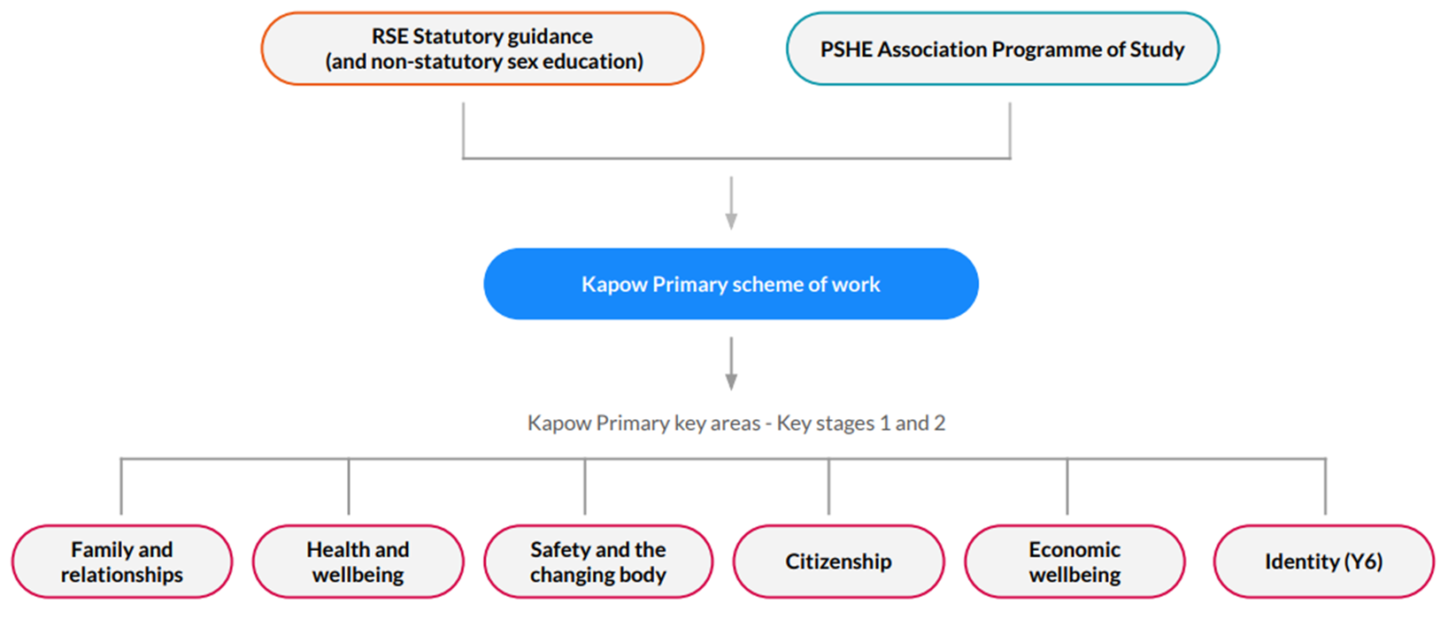 Kapow PSHE is delivered through a spiral curriculum model, meaning that key themes are revisited each year with increasing depth and complexity. Lessons are structured across five key areas: Families and Relationships, Health and Wellbeing, Safety and the Changing Body, Citizenship, and Economic Wellbeing. In addition, Year 6 receives specific content on Identity and Transition to support a confident move to secondary education.