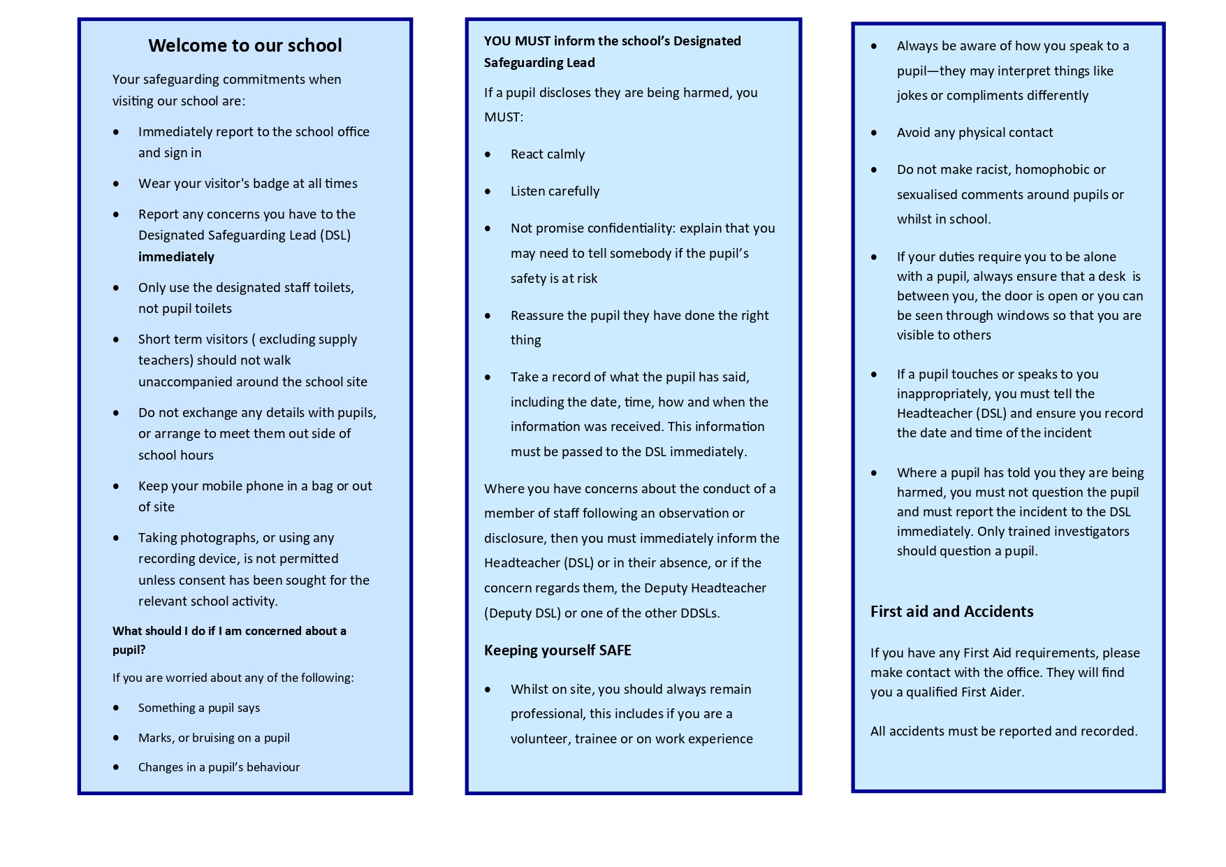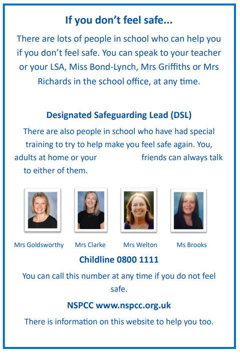 Every school has a Designated Safeguarding Lead (DSL) and deputy DSLs. Staff who have these responsibilities attend comprehensive safeguarding training and are responsible for ensuring that all staff are aware of their safeguarding duties. In our school Mrs Goldsworthy is the Designated Safeguarding Lead, and Mrs Clarke, Miss Brooks, Mrs Welton and Miss Bond-Lynch are the Deputy Designated Safeguarding Leads.