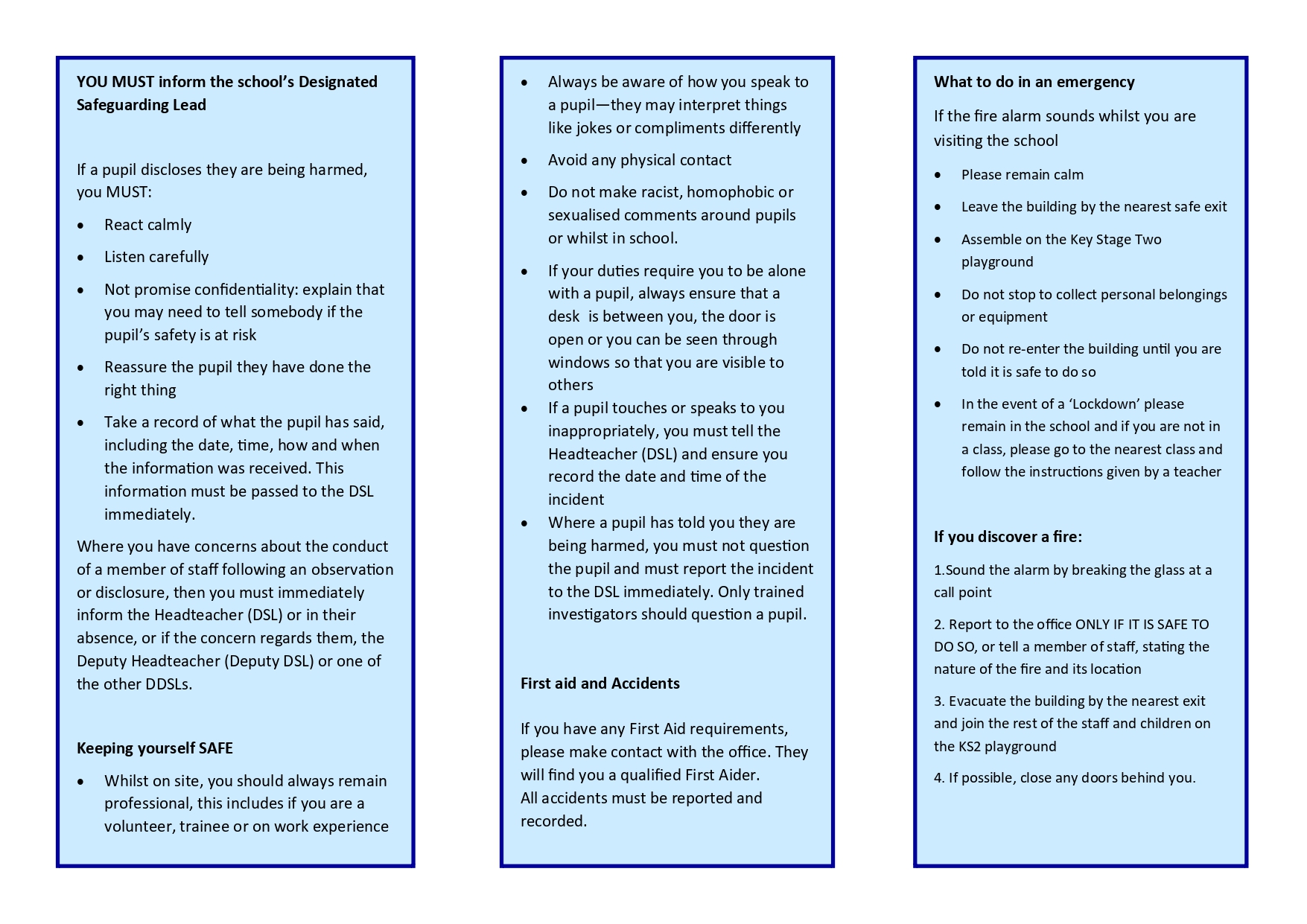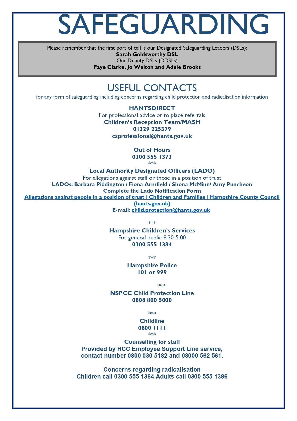 The school has a duty of care to all children and procedures are in place to ensure their safety and well-being. The school works closely with parents and outside agencies, including social care, if there are any concerns about a child’s welfare. The Headteacher is the ‘Designated Safeguarding Lead’ (DSL) with three additional members of staff trained as deputy DSLs. If you have concerns about the wellbeing of any child, we would strongly encourage you to speak in confidence with one of the school’s designated safeguarding leads (contactable via the school office).